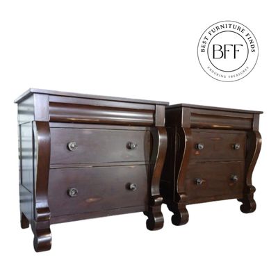 An elegant and substantial pair of Lauren by Ralph Lauren nightstands crafted in rich, dark-stained wood with a warm, gently distressed finish. Each piece features classic Empire-inspired curves with scroll legs and bold serpentine sides, giving them a timeless and refined look. The two deep drawers and one shallow drawer glide smoothly, offering generous storage for bedside essentials. Original turned wood knobs complete the sophisticated design.